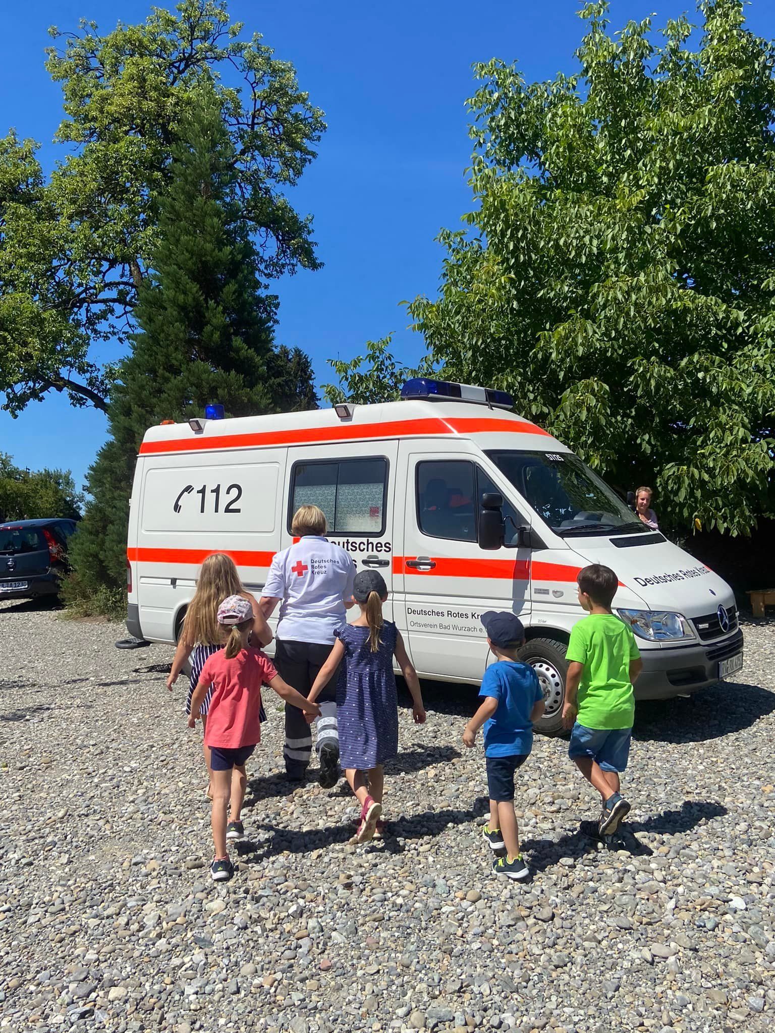 Zusammen erkundeten sie das komplette Fahrzeug, es wurde fleißig verbunden, das Blaulicht getestet und zum Schluss erhielt jedes Kind noch ein Rot-Kreuz Abzeichen 😊