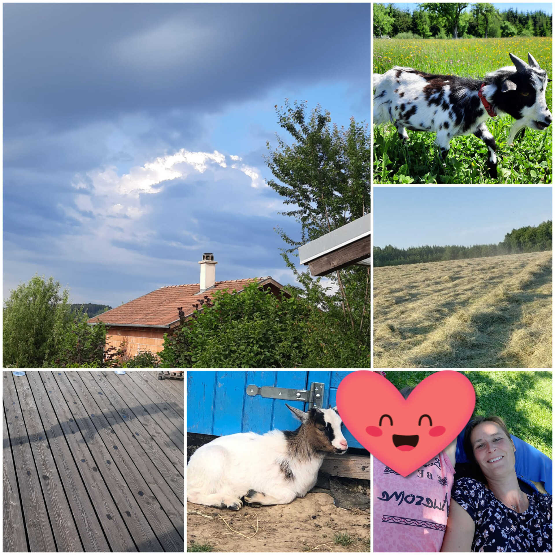 ... der Himmel verdunkelt sich, die ersten schweren Tropfen fallen... noch sind alle entspannt --> 4Beiner und 2Beiner :-) Wird das Wetter noch halten? Ist die Arbeit und das tolle Gras vom 1. Schnitt verloren? Können wir das Heu doch gut einbringen, mit all seinen wertvollen MineralStoffen? Ja, wir haben Glück - mittags noch ein Gewitter, welches uns nur kurz streift. Und dann geht's los - Heu einbringen -- ich liebe es, der rote Flitzer und ich .... von wegen MännerSpielZeug LOL Vielen Dank allen Helfern! HeuNetzWerk das heißt: gestern meine Wiese zum warm werden, heute helfen wir bei über 6 ha :-) Auch das ist LandLeben: wir sind auf dieser Erde, um einander zu helfen und zu unterstützen zusammen schaffen wir jeden HeuBerg :-)